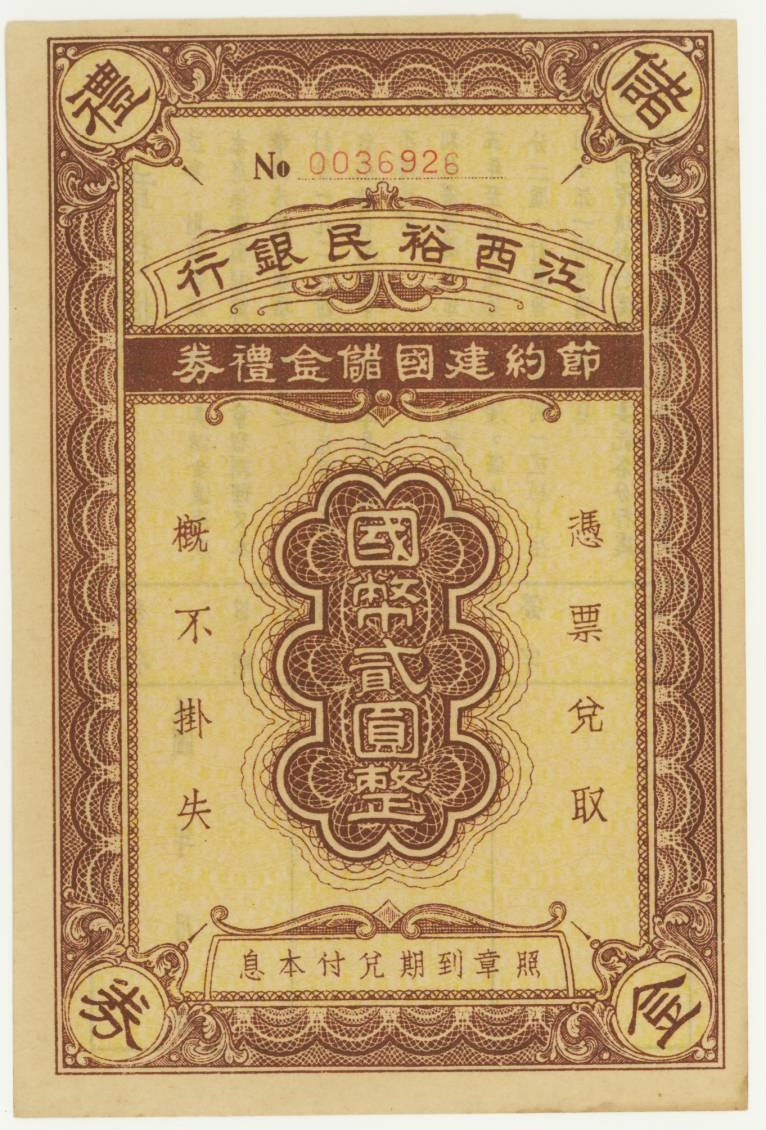 591番 中国 江西裕民銀行 儲金礼券 国幣2円整 |