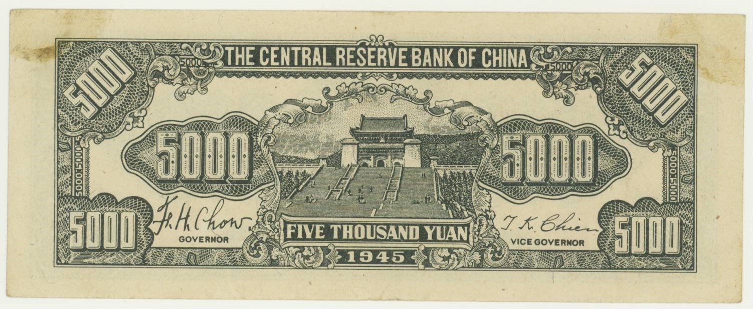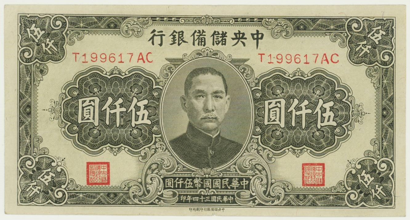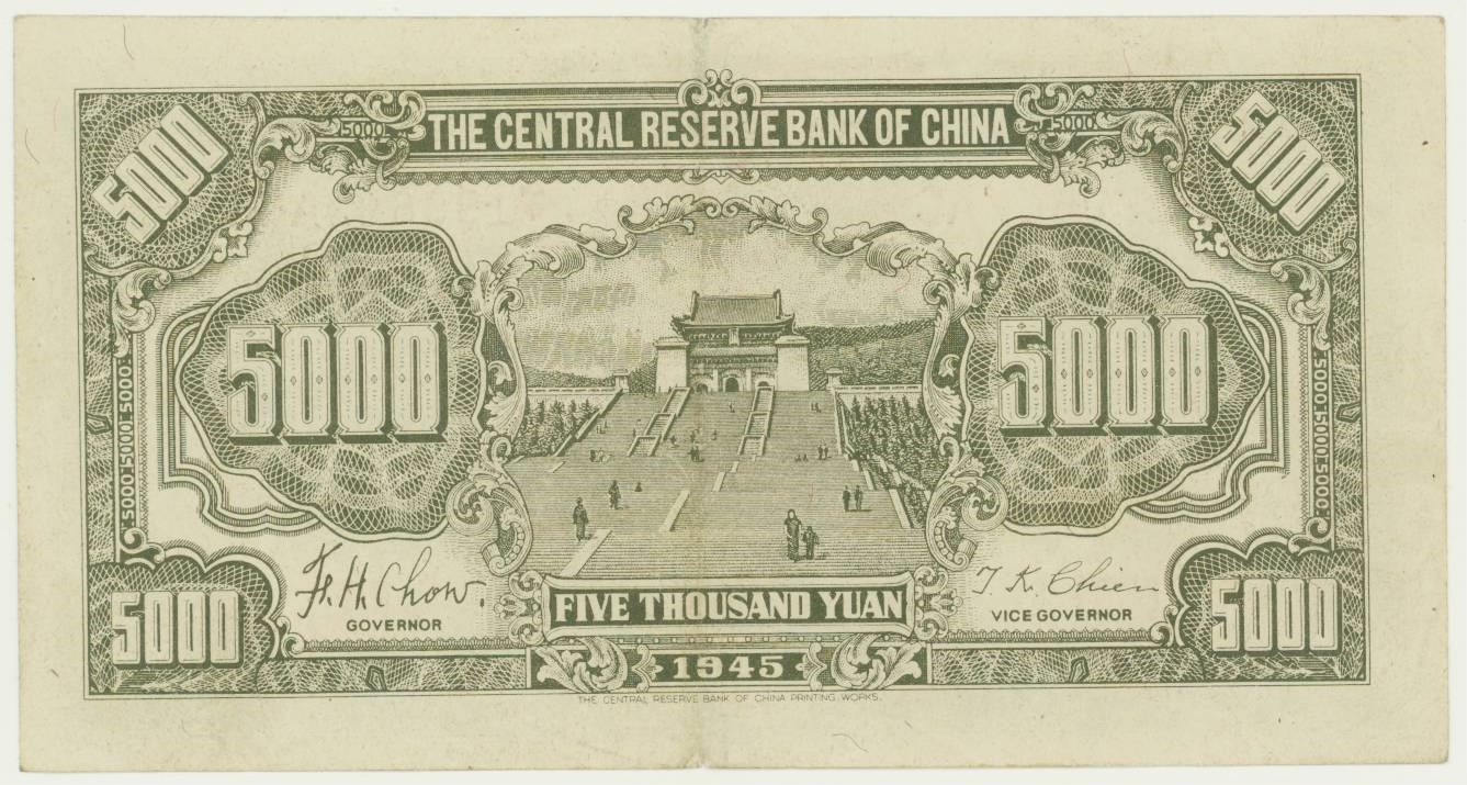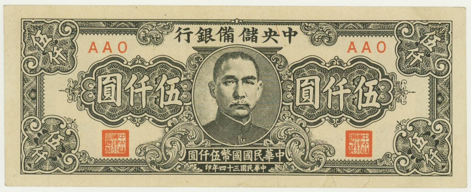 607番 中央儲備銀行5000円 記号のみ 横長 民34 外283 裏2ヶ所剥シ跡 |