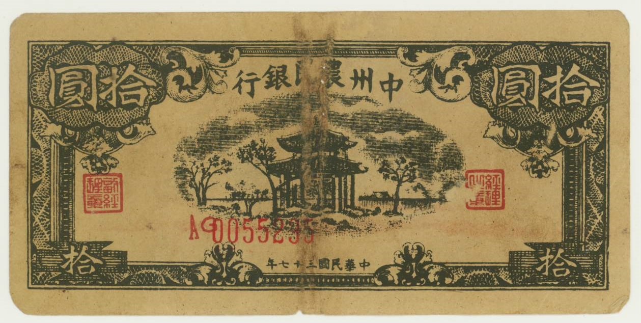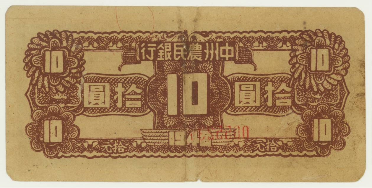 612番 中州農民銀行10円 民37 小ヘゲ 折目に穴多数 |