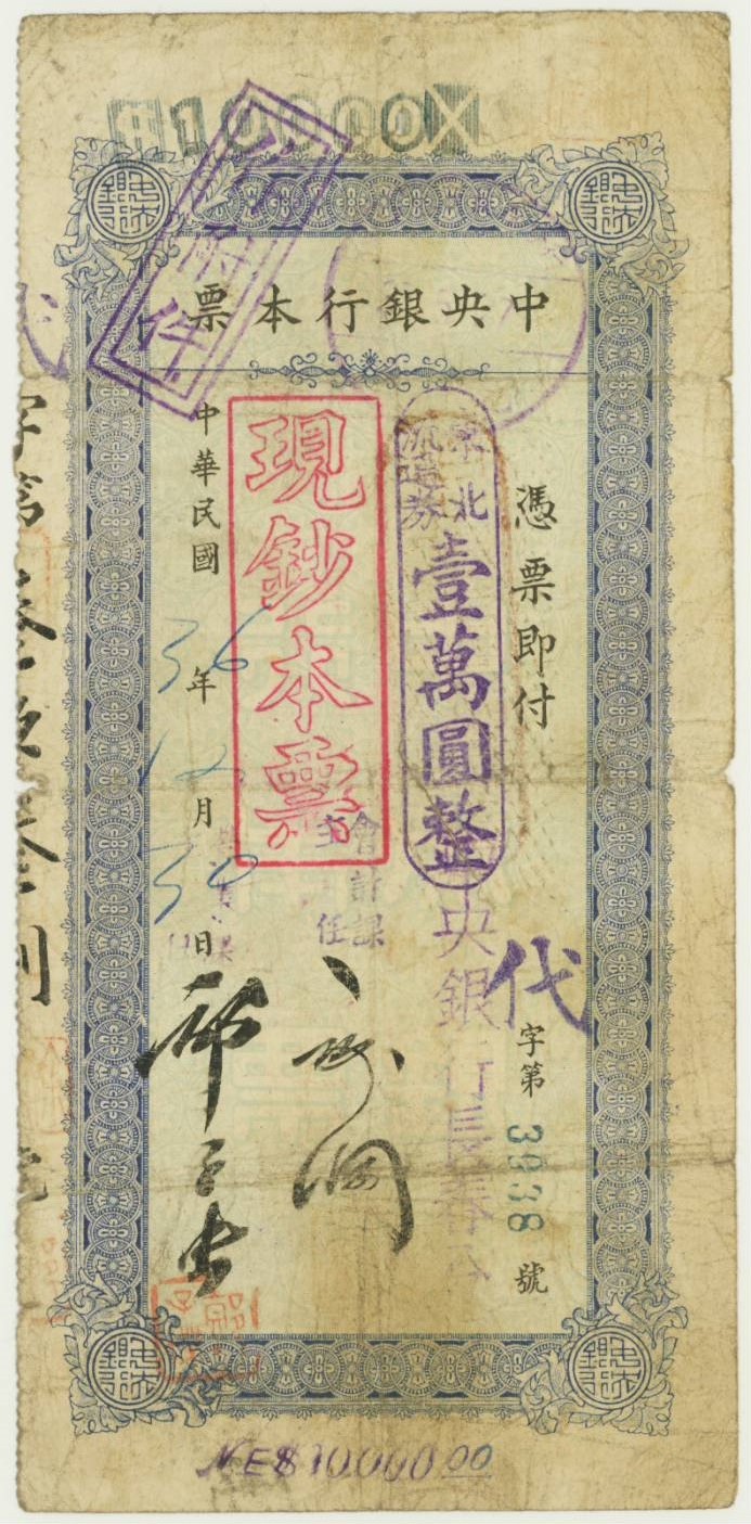 | 613番 中央銀行 長春分行 現鈔本票1万円 民36 小破レ |