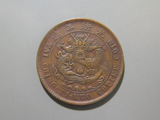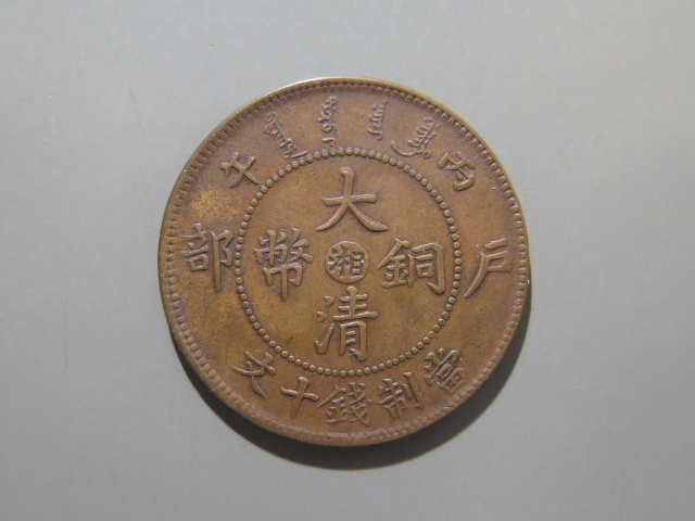 744番 銅幣 大清銅幣 光緒年造 丙午10文 中央湘 背乙字竜 |