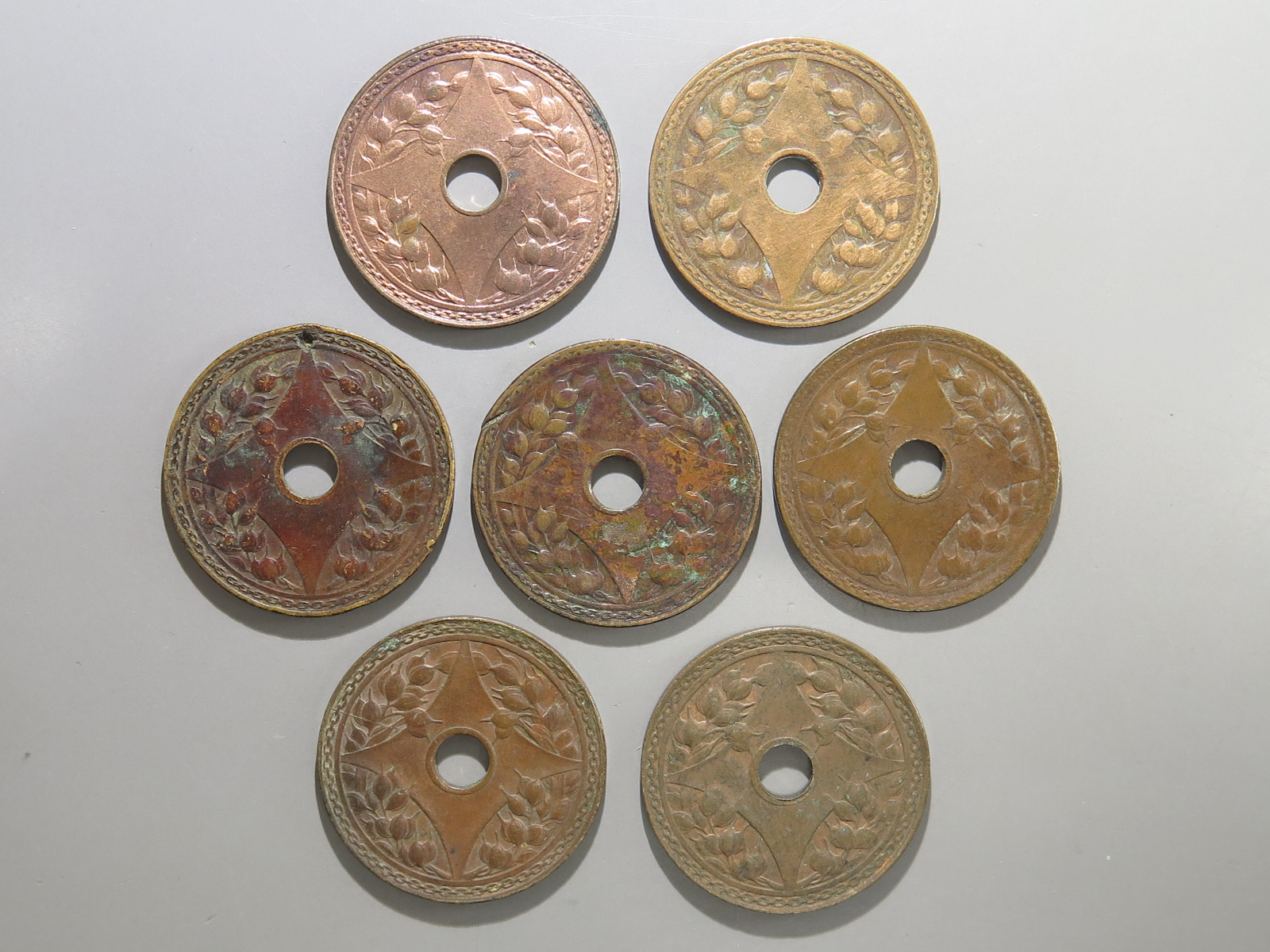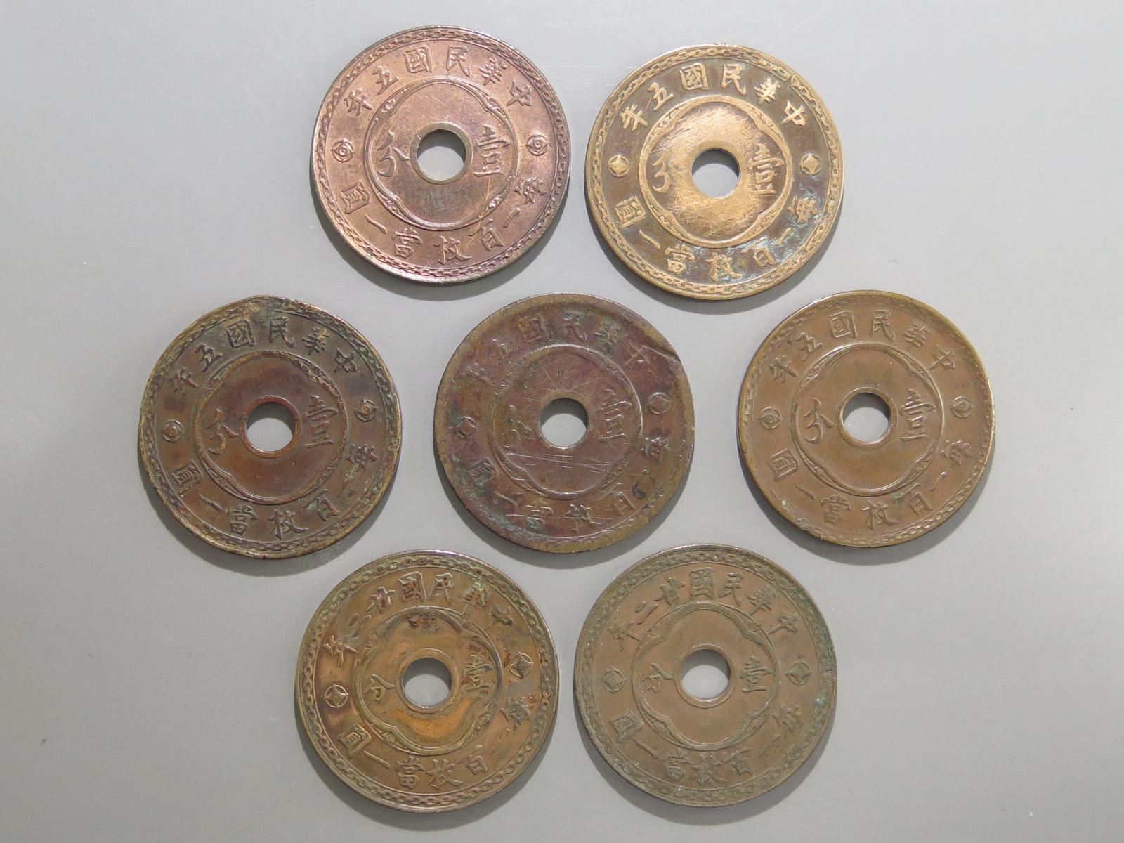 752番 中国 1分銅 民5(5) Y324, 民22(2) Y324a 穴,キズ, 錆含む計7枚 |