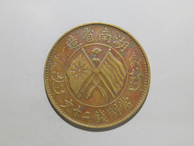 700番 銅幣 湖南省造20文 扁萄花 90度傾打 |