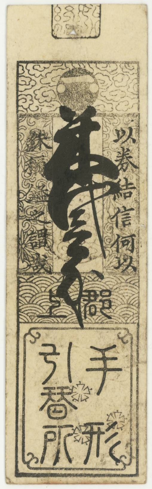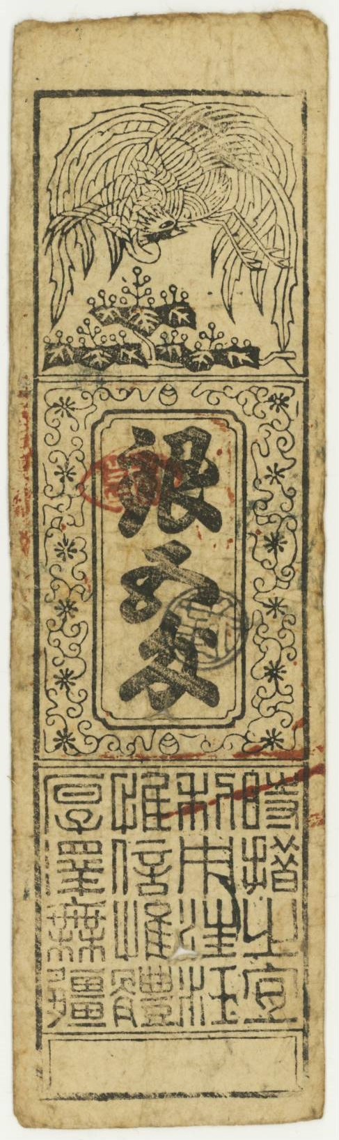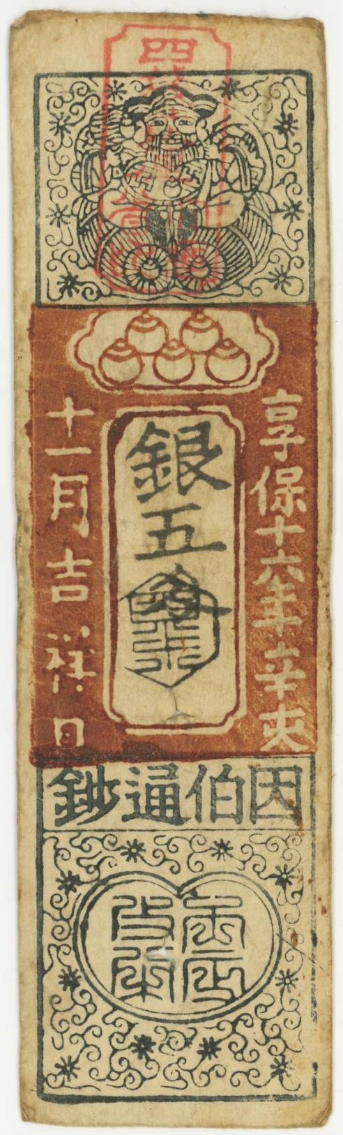 543番 藩札 鳥取藩 因伯通鈔 銀五匁 安政札 綴り穴 大蔵省 加印 |