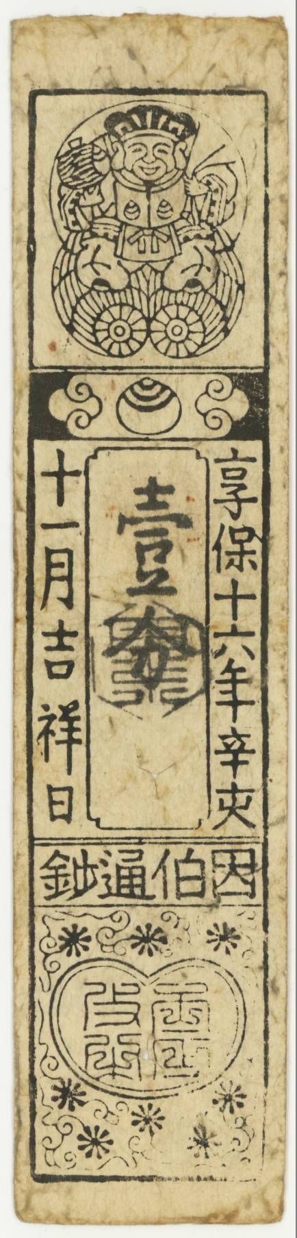 545番 藩札 鳥取藩 因伯通鈔 銀一分 安政札 綴り穴 |