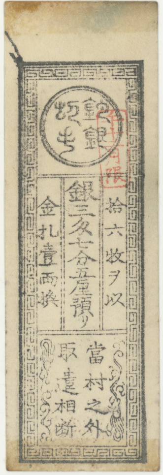 605番 藩札 平藩 銀三匁七分五厘預り |