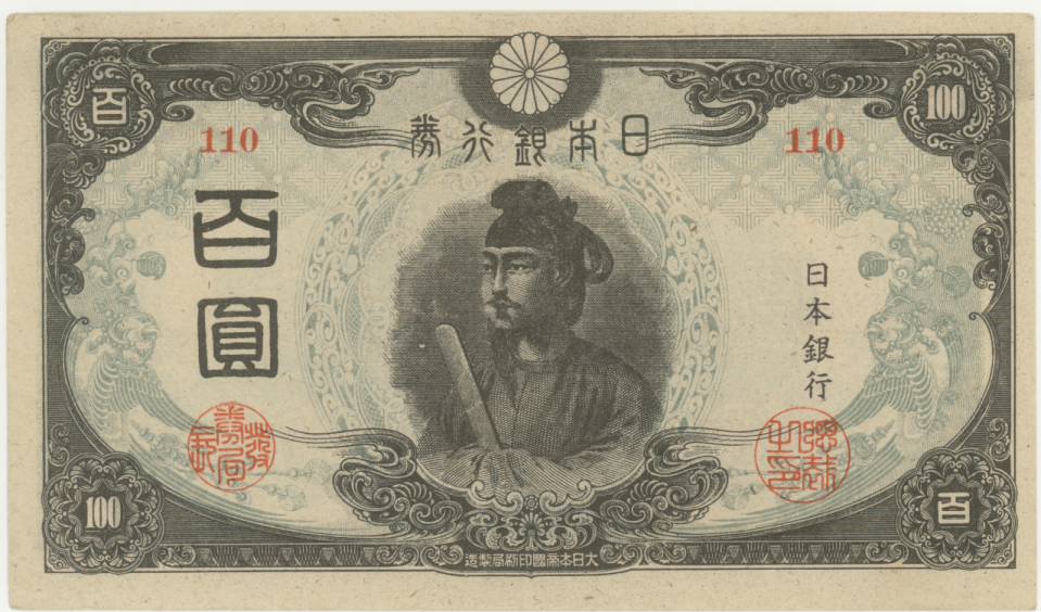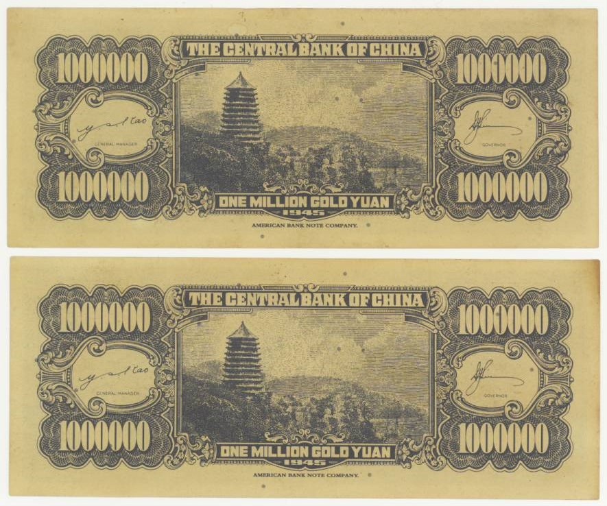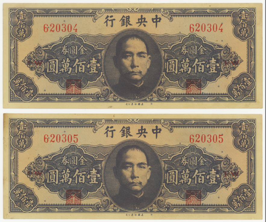 | 615番 中央銀行 金円券100万円 1945 連番2枚 |