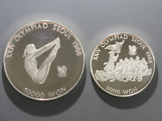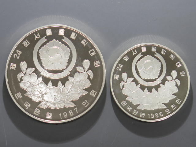 725番 韓国 ソウル五輪 1万W,5000Wプルーフ銀 2点セット 1986,1987 |